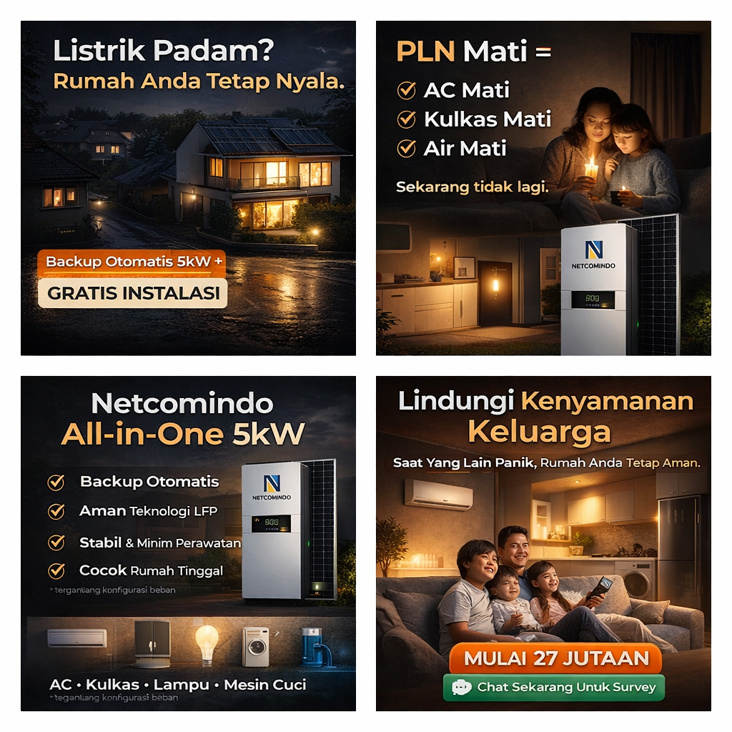 Netcomindo percaya bahwa energi mandiri bukan lagi sekadar pilihan, melainkan investasi masa depan. Karena itu, setiap solusi yang kami tawarkan dirancang khusus untuk kebutuhan rumah tinggal, pabrik, sekolah, rumah sakit, hotel, vila, apartemen mulai dari pemakaian harian hingga perlindungan saat listrik padam.