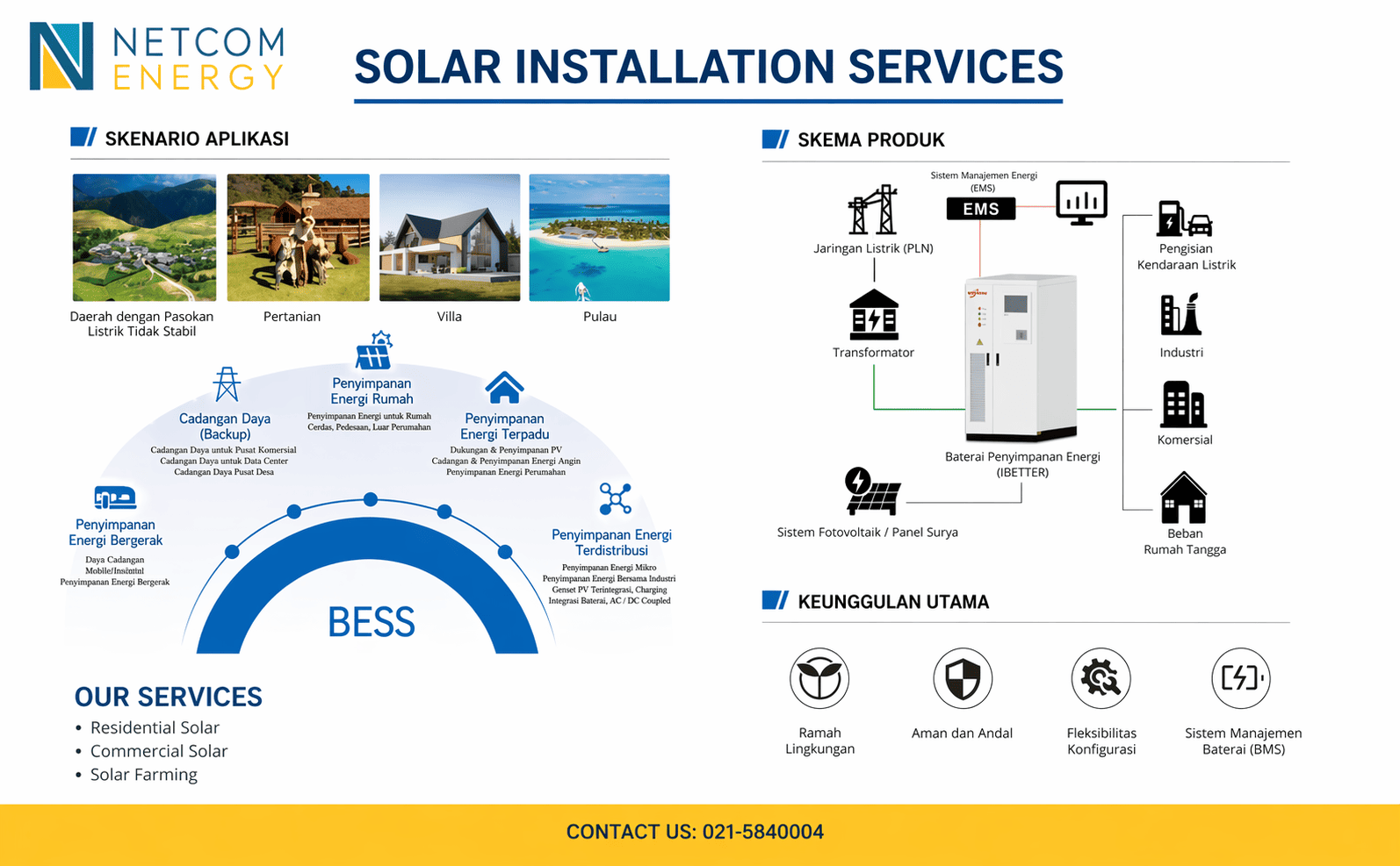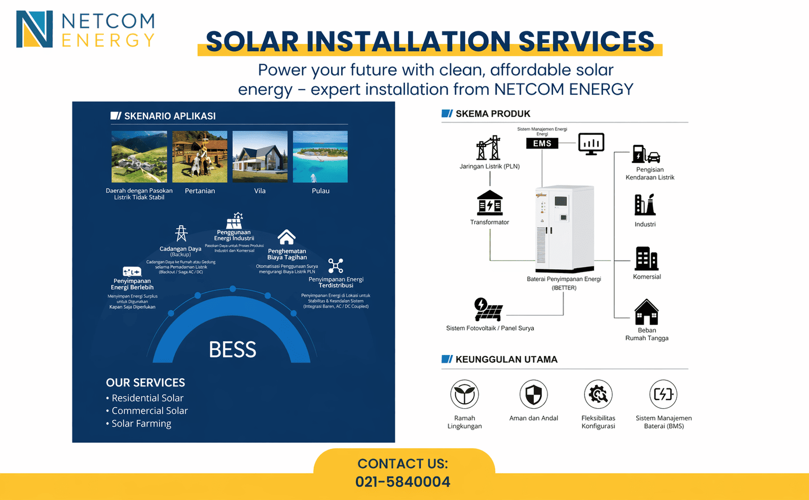 Dengan teknologi ESS yang scalable dan efisien, Netcomindo memberikan solusi energi yang dirancang untuk masa depan industri yang lebih mandiri dan berkelanjutan.