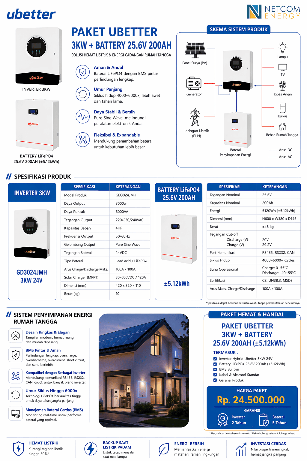 Kami menyediakan sistem panel surya All-in-One yang dirancang praktis, aman, dan efisien, membantu Anda mengurangi ketergantungan pada listrik konvensional sekaligus menekan biaya tagihan bulanan. Dengan teknologi inverter mulai dari 5 kW dan baterai LFP 5 kWh dalam satu unit, solusi Netcomindo menawarkan kemudahan instalasi, keandalan jangka panjang, dan desain rapi yang menyatu dengan modern.